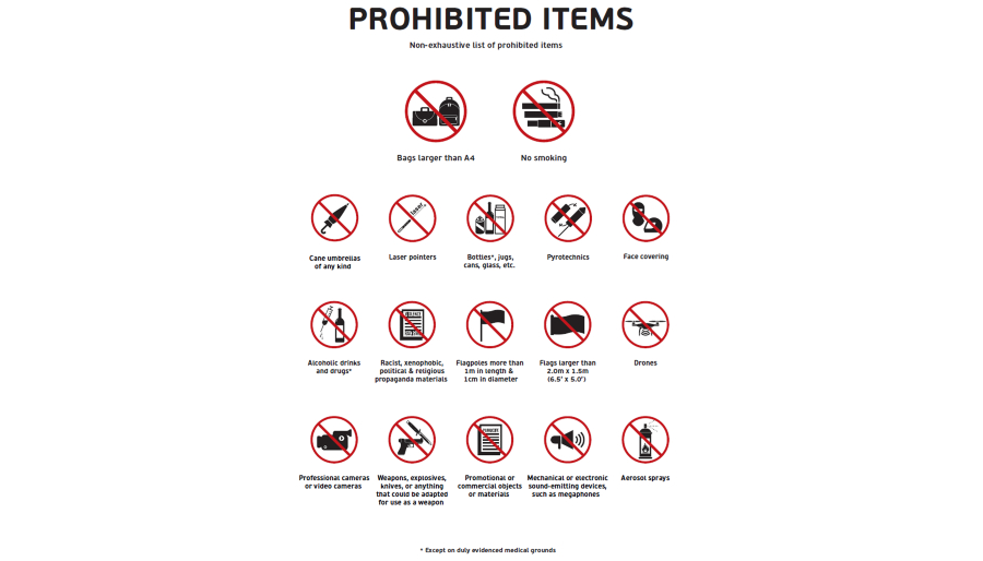 Η ΕΠΟ υπενθυμίζει στους Έλληνες φιλάθλους ότι πέραν της έγκαιρης προσέλευσης, θα πρέπει να ακολουθούν τις υποδείξεις των αρχών και να γνωρίζουν ότι απαγορεύεται να φέρουν μαζί τους μια σειρά αντικειμένων τα οποία απεικονίζονται στην ακόλουθη φωτογραφία