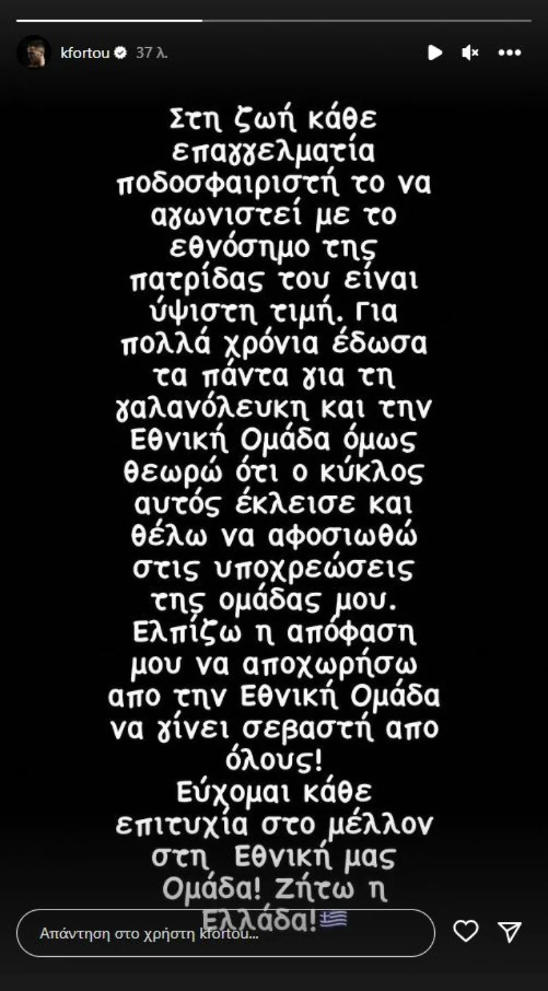 Αναλυτικότερα, ο έμπειρος μέσος του Ολυμπιακού σε ανακοίνωσή του στο Instagram τόνισε ότι θα σταματήσει από το αντιπροσωπευτικό μας συγκρότημα και ευχήθηκε καλή επιτυχία στην ομάδα.