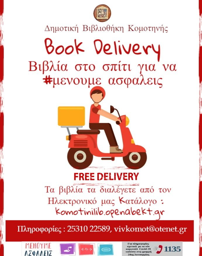 Η Δημοτική Βιβλιοθήκη Κομοτηνής στο πλαίσιο της αντιμετώπισης του κορωνoϊού COVID-19, με μεγάλη χαρά σας ανακοινώνει,  ότι προκειμένου να ικανοποιήσει τις ανάγκες του αναγνωστικού κοινού και για να μένουμε όλοι ασφαλείς (για να #Μένουμε_Ασφαλείς),  αναλαμβάνει από σήμερα 28 Δεκεμβρίου 2021,  τη Δωρεάν Παράδοση Βιβλίων στο σπίτι – BookDelivery – για να #Μένουμε_Ασφαλείς.